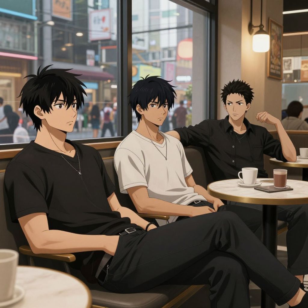 Anime filter picture capturing a cozy café interior with characters enjoying warm drinks, soft sunlight streaming through large windows, subtle reflections on glass surfaces, warm color palette, and charming, expressive character poses rendered in elegant anime style.