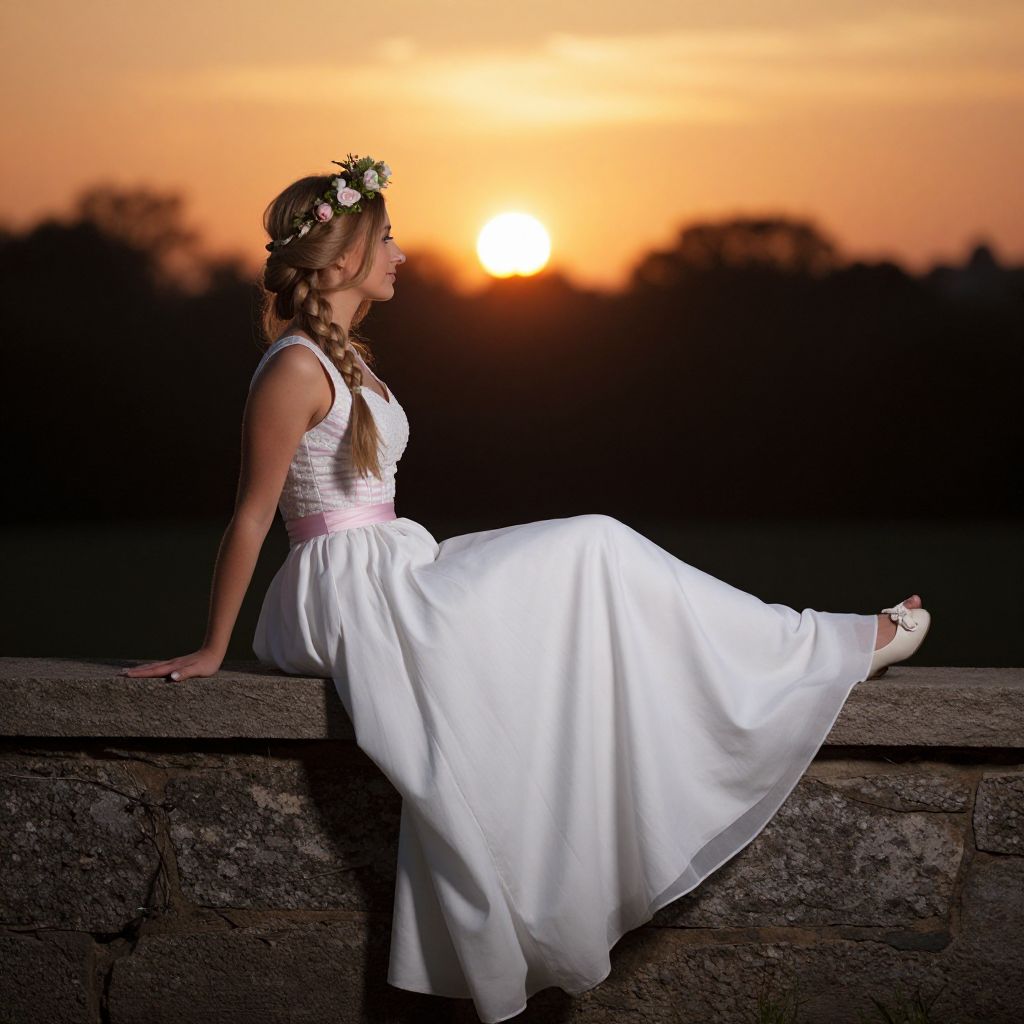 Photograph of a young woman with light brown hair in braids, wearing a white, sleeveless, ball-gown wedding dress with a pink sash and white floral crown. She sits on a stone wall, legs extended, with white ballet flats, gazing at an orange sunset in the background. The sky is a gradient of orange and yellow, with dark silhouettes of trees. The woman's profile is illuminated by the sunlight, highlighting her serene expression. The stone wall is textured and rough, contrasting with the smoothness of her dress. The overall scene is romantic and tranquil.