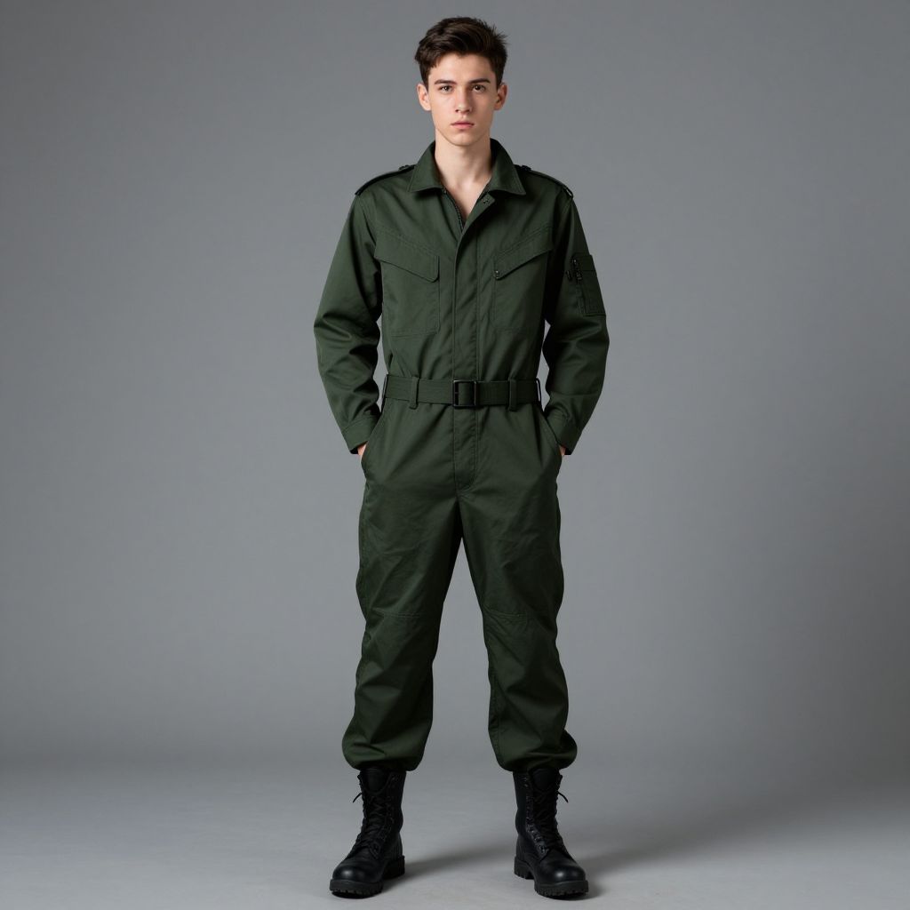 Photograph of a young Caucasian man with short, dark brown hair and fair skin standing against a plain, light gray background. He wears a dark green, long-sleeve, button-up jumpsuit with pockets and a belt, and black combat boots. His hands are casually placed in his jumpsuit's front pockets, and he gazes directly at the camera with a neutral expression. The lighting is even, highlighting the textures of the jumpsuit and the smoothness of his skin. The overall style is minimalist and modern.