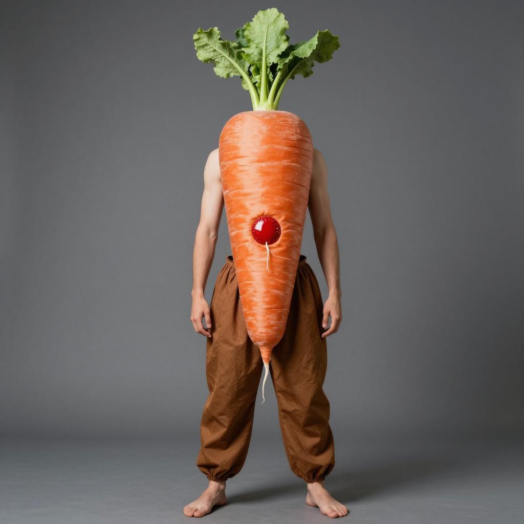 Radish costume, photograph of man in costume, carrot costume, red shiny center, brown baggy pants, barefoot, green leafy hat, gray background, standing pose, studio lighting, surreal, quirky, high contrast, detailed, front view