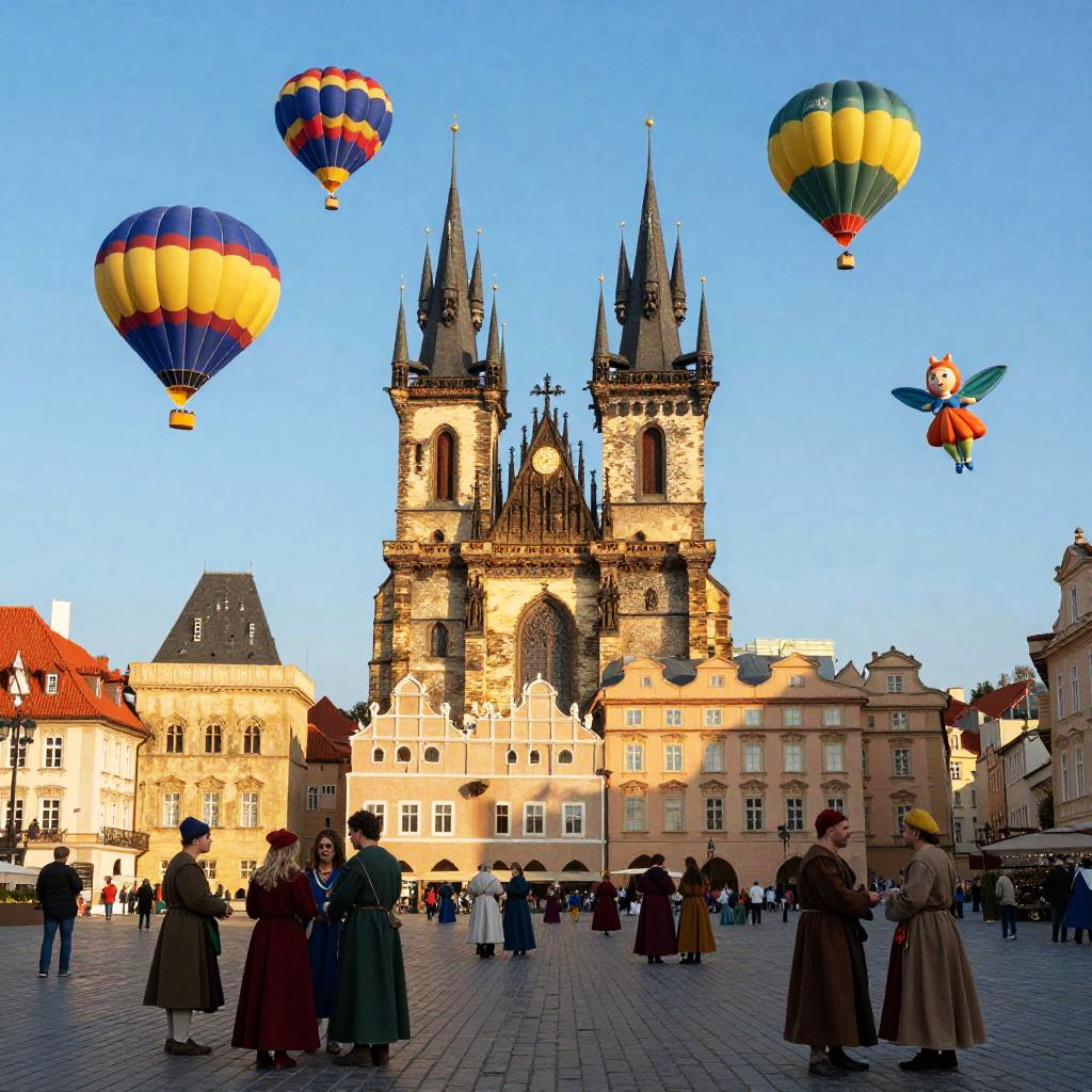 This colorful photograph captures a bustling town square during sunset. The square is filled with people dressed in medieval-style clothing, standing and chatting. At the center is a grand Gothic-style church with a tall spire, flanked by other buildings with red-tiled roofs. Floating in the bright blue sky are colorful hot air balloons and whimsical fairy-like figures. The sunlight casts warm, golden hues over the scene.