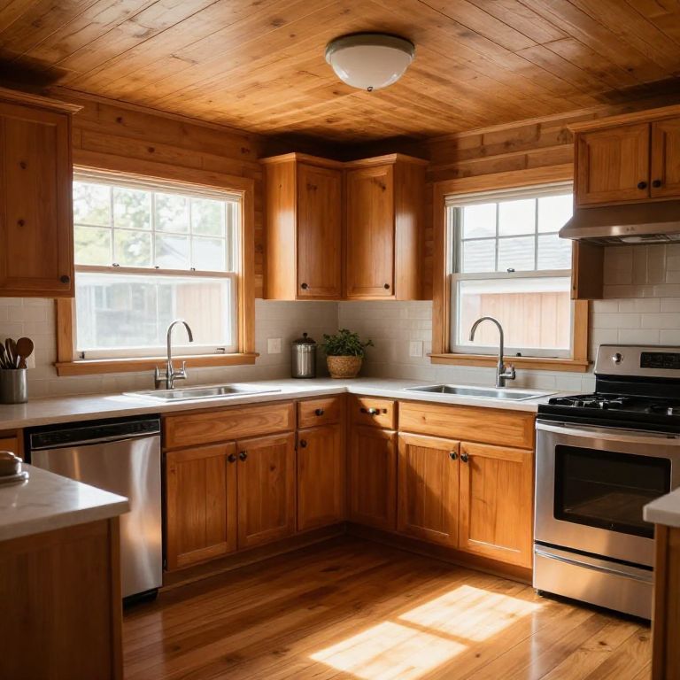 Natural light streams through two large windows, illuminating a cozy kitchen with warm wooden walls, ceiling, and cabinetry, complemented by stainless steel appliances and a polished wooden floor.