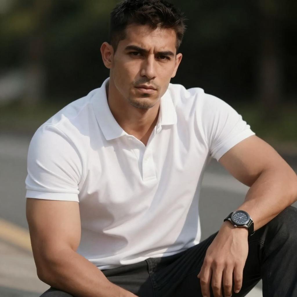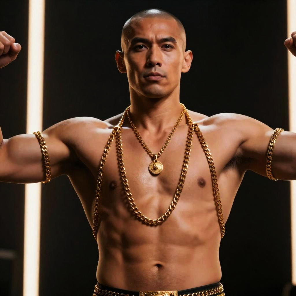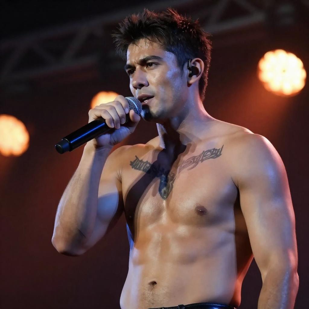 Photograph of a shirtless, muscular man with short, dark hair and tattoos on his chest, holding a microphone. He has a blue-tinted light illuminating his face and upper body. The background features blurred, bright orange lights and a dark, arched structure. The man's expression is intense, and he is slightly turned to the side.