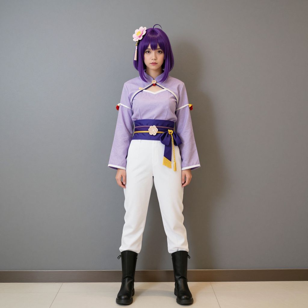 Photograph of a young woman standing against a plain gray wall. She has straight, dark purple hair with a white flower accessory on the right side. She wears a light purple, long-sleeved top with white trim and a navy blue belt with a white floral ornament. Her white pants are tucked into black boots. The top has small navy blue accents on the shoulders. The woman has a neutral expression and is centered in the image, with her arms relaxed by her sides. The floor is light beige with a dark gray baseboard at the bottom.
