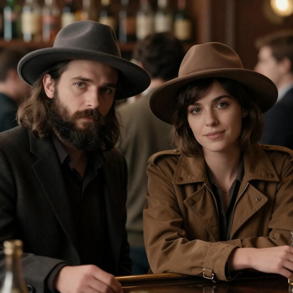 Photograph of two people in a crowded bar. The man on the left has long dark hair, a thick beard, and wears a large gray hat and dark suit. The woman on the right has short brown hair, a light brown hat, and a brown jacket. She leans on the bar with a slight smile. Both have intense gazes. Background includes blurred people and bottles.