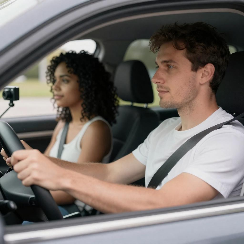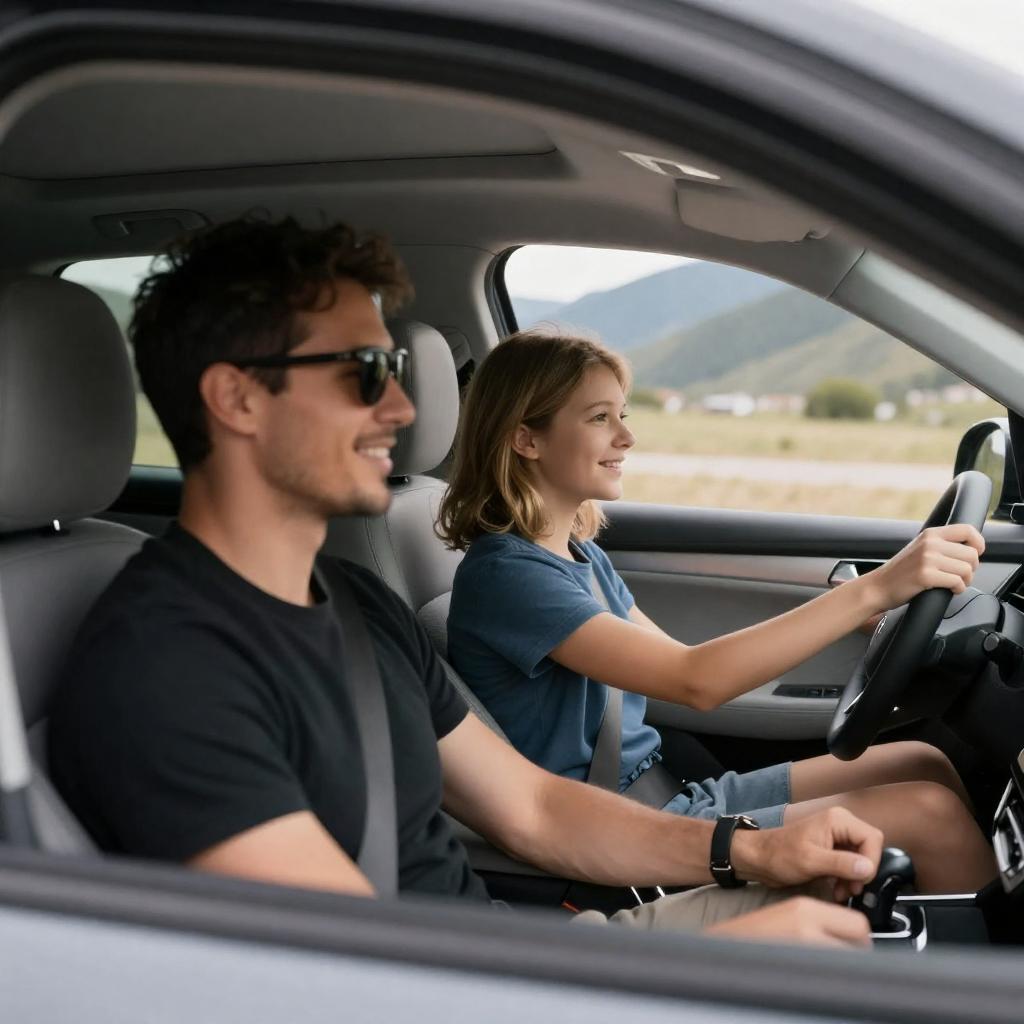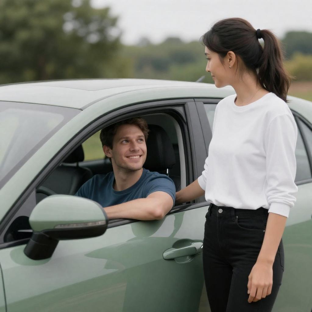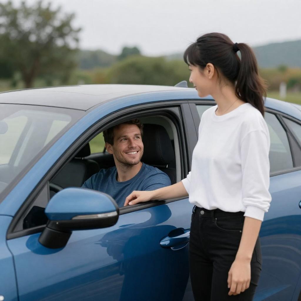 Photograph of a woman with dark hair in a ponytail, wearing a white long-sleeve shirt and black pants, standing beside a blue car. A smiling man with short brown hair, in a blue t-shirt, sits in the driver's seat, looking at her. The background shows green trees and a cloudy sky.