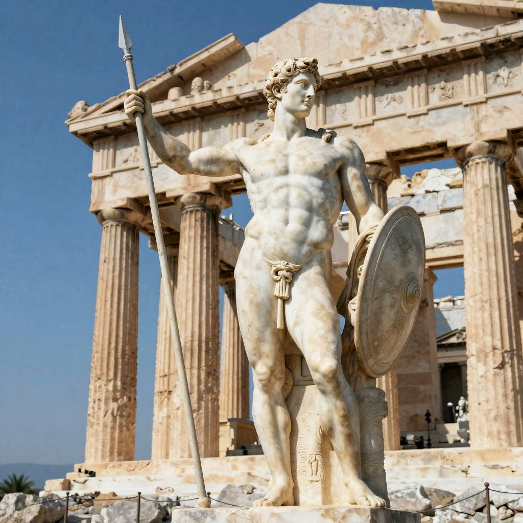 Jacked Greek statue in a heroic pose, marble figure with exaggerated muscles and defined veins, holding a spear and shield, set against a backdrop of an ancient temple with soaring columns and clear blue sky, hyper-realistic stone texture.