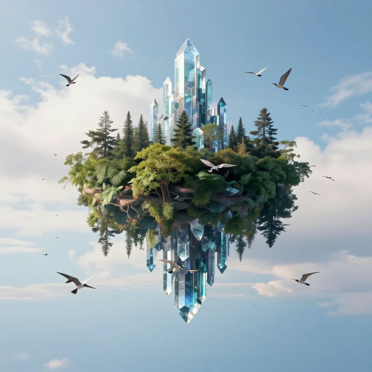 Suspended between earth and sky, a crystalline spire cradles an inverted forest, where gravity defies logic and birds soar through ethereal air, evoking a surreal harmony of freedom and transcendence.