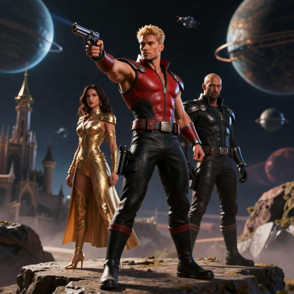 Muscular man in red and black costume with blonde hair, pointing gun, standing on rocky platform. Two women in ornate, gold outfits. Bald man with intense expression in the background. Space scene with planets, castle, and flying ships.