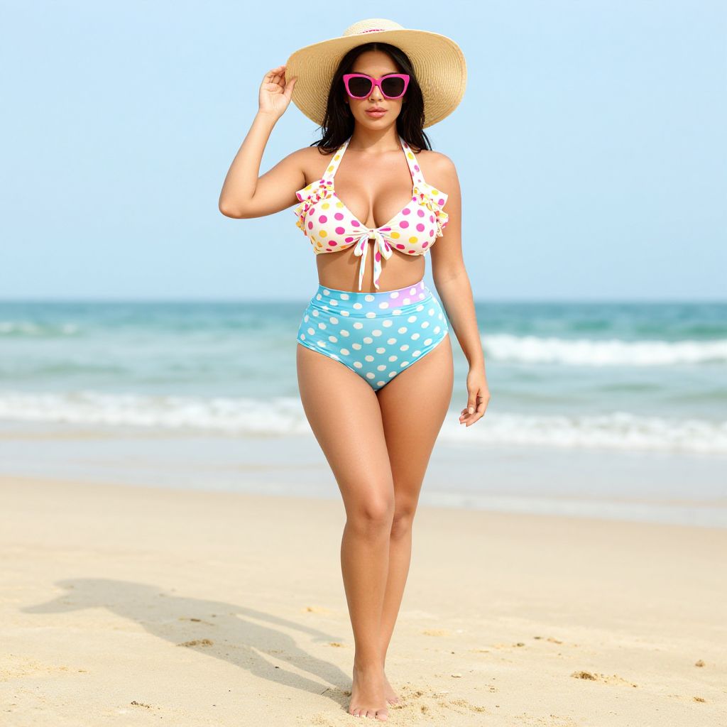 Full body shot, Busty woman, retro swimwear, vibrant polka dots, tie-front top, high-waisted bikini bottoms, soft stretchy fabric, vintage-inspired cut, halter neck design, playful ruffles, bright colors, oversized sunglasses, wide-brimmed straw hat, beach sandals, sun-kissed skin, playful beach setting Sexy. Pretty face and beаutiful eyes. Big breasts