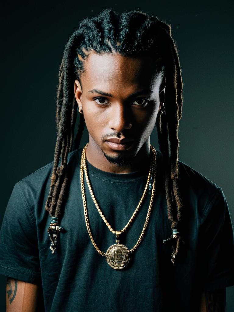 Hip hop style, 1boy, solo, male focus, dreadlocks, necklace, jewelry, dark-skinned male, black hair, shirt, looking at viewer, dark skin, realistic, portrait