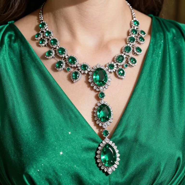 Photograph of a woman wearing a lush green dress with an elaborate emerald and diamond necklace, featuring oval and round gemstones, sparkling against her fair