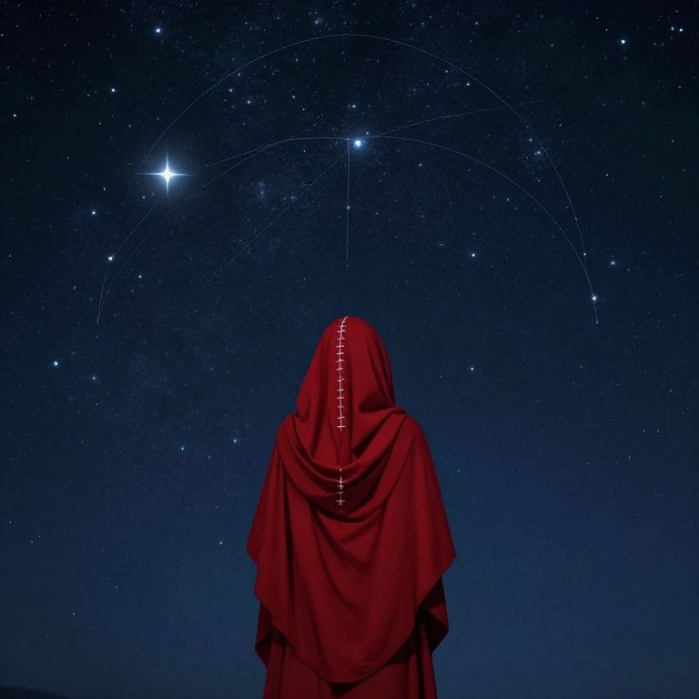 Mysterious figure in red hooded cloak gazes at starry night sky with constellations, digital art, deep blue background.