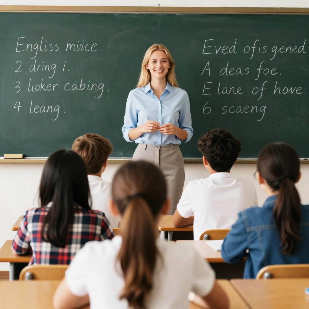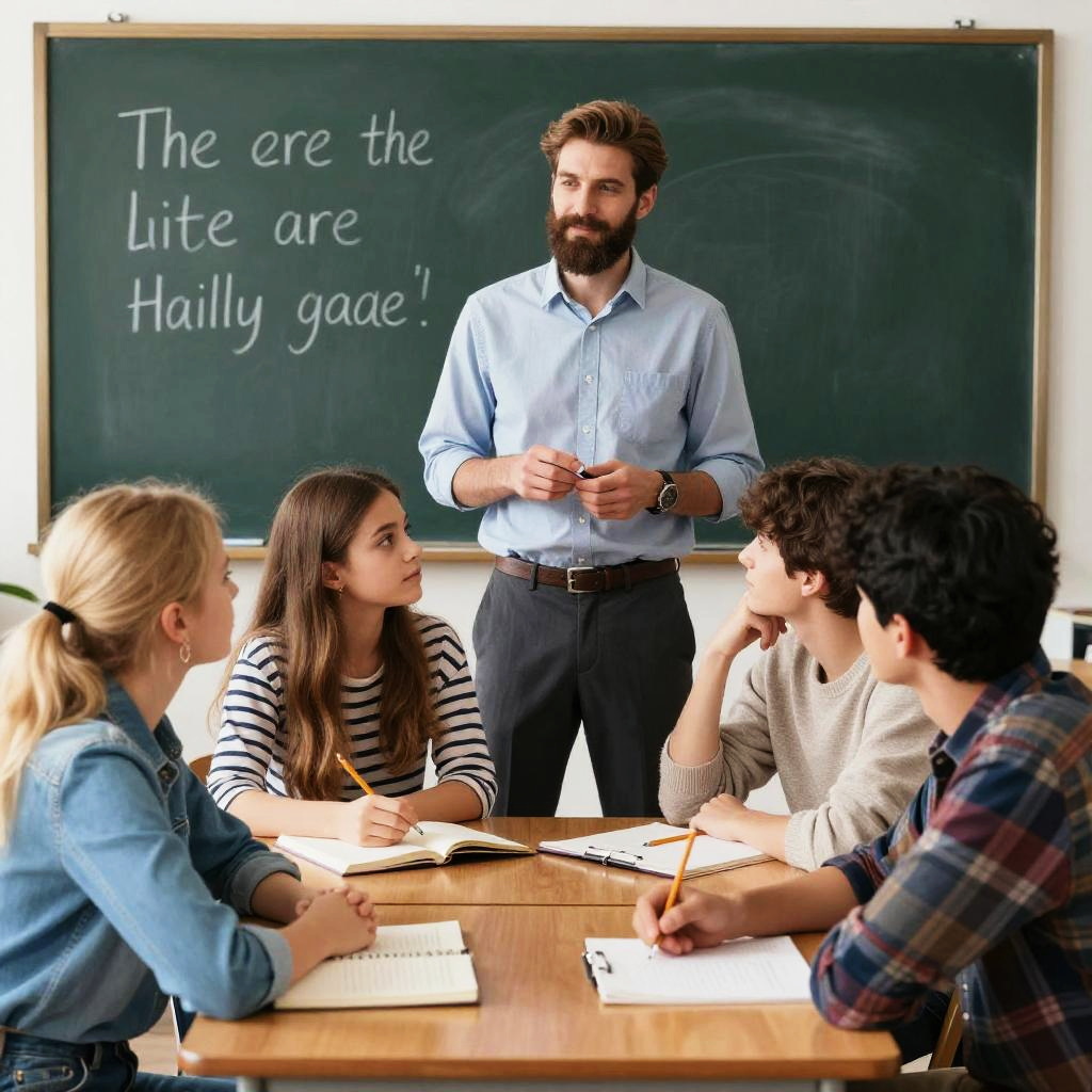 Multiple girls, multiple boys, chalkboard, blonde hair, teacher, classroom, brown hair, from behind, desk, 3girls, long hair, ponytail, short hair, indoors, 4girls, plaid, blurry, black hair, jacket, smile, shirt, realistic, 3boys, english text, 2girls