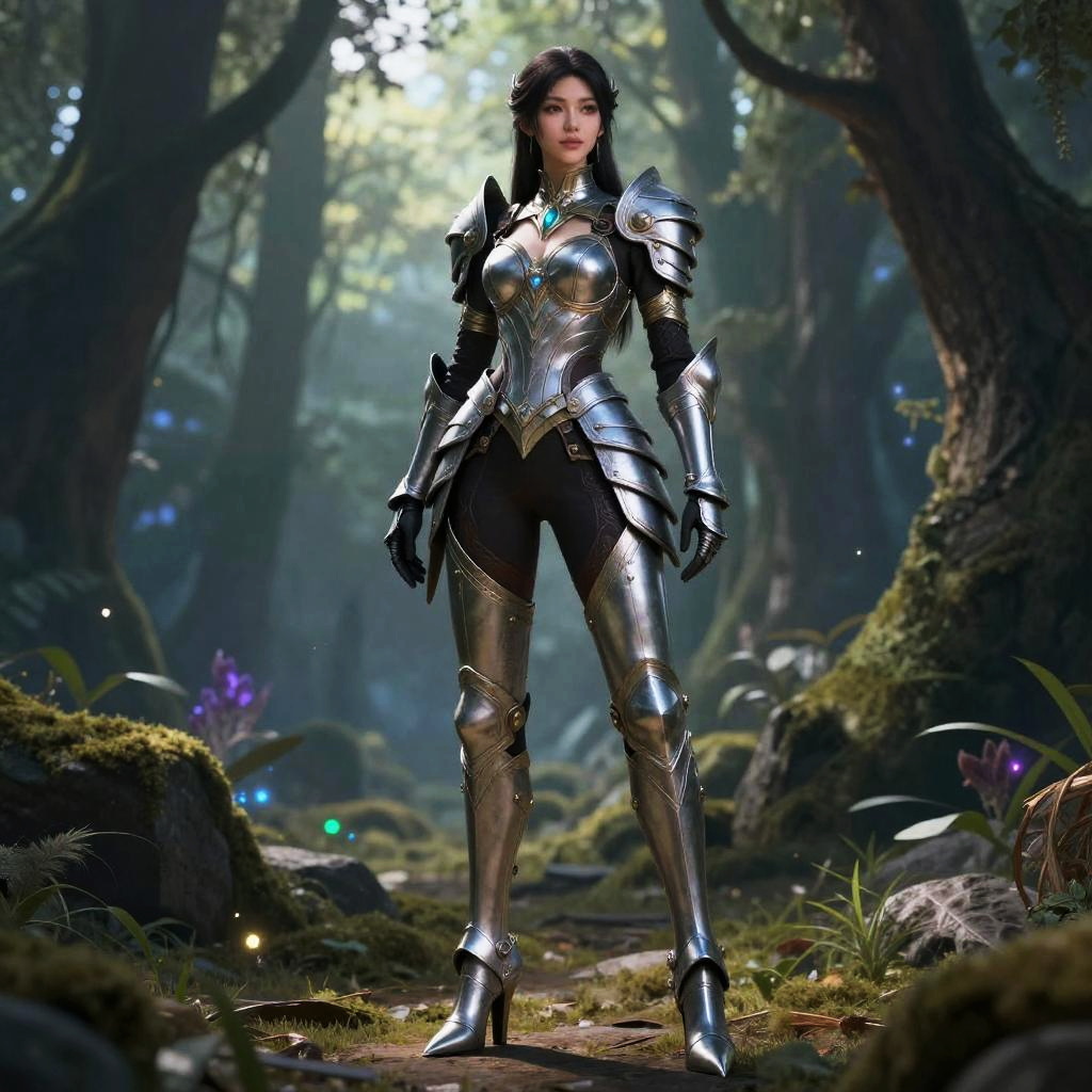 Bodysuit with heels, fantasy warrior girl, intricately designed armor bodysuit, towering sharp heels, mystical forest background, soft magical light, highly detailed character art