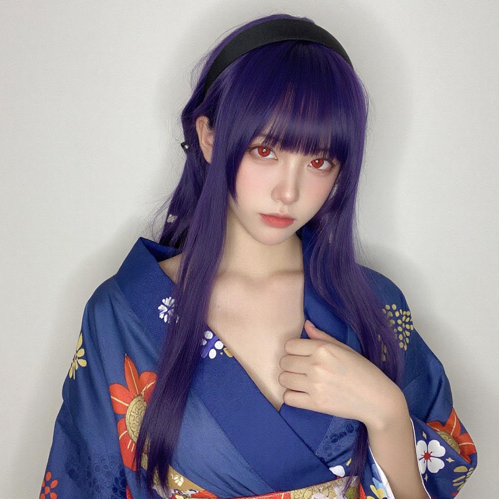 Photograph of an Asian woman with long purple hair, wearing a black hat and blue, gold-trimmed, traditional Chinese-style top with red floral accents. She is topless, exposing her small, pale breasts, with her hands partially covering them. She has red eyes, pale skin, and red lipstick, looking directly at the camera with a neutral expression. The background is plain white.