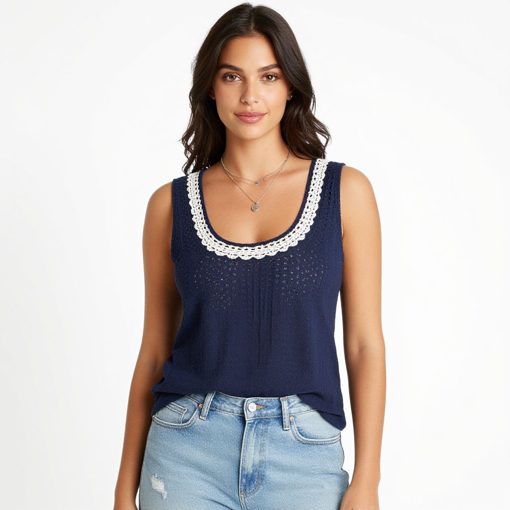 "Woman, casual bohemian, navy blue sleeveless top with eyelet lace detailing, white crochet trim, scoop neckline, light-wash denim jeans with subtle distressing, layered necklaces, minimal makeup, smile, plain white studio background.. Sexy. Pretty face and beаutiful eyes. Big breasts."