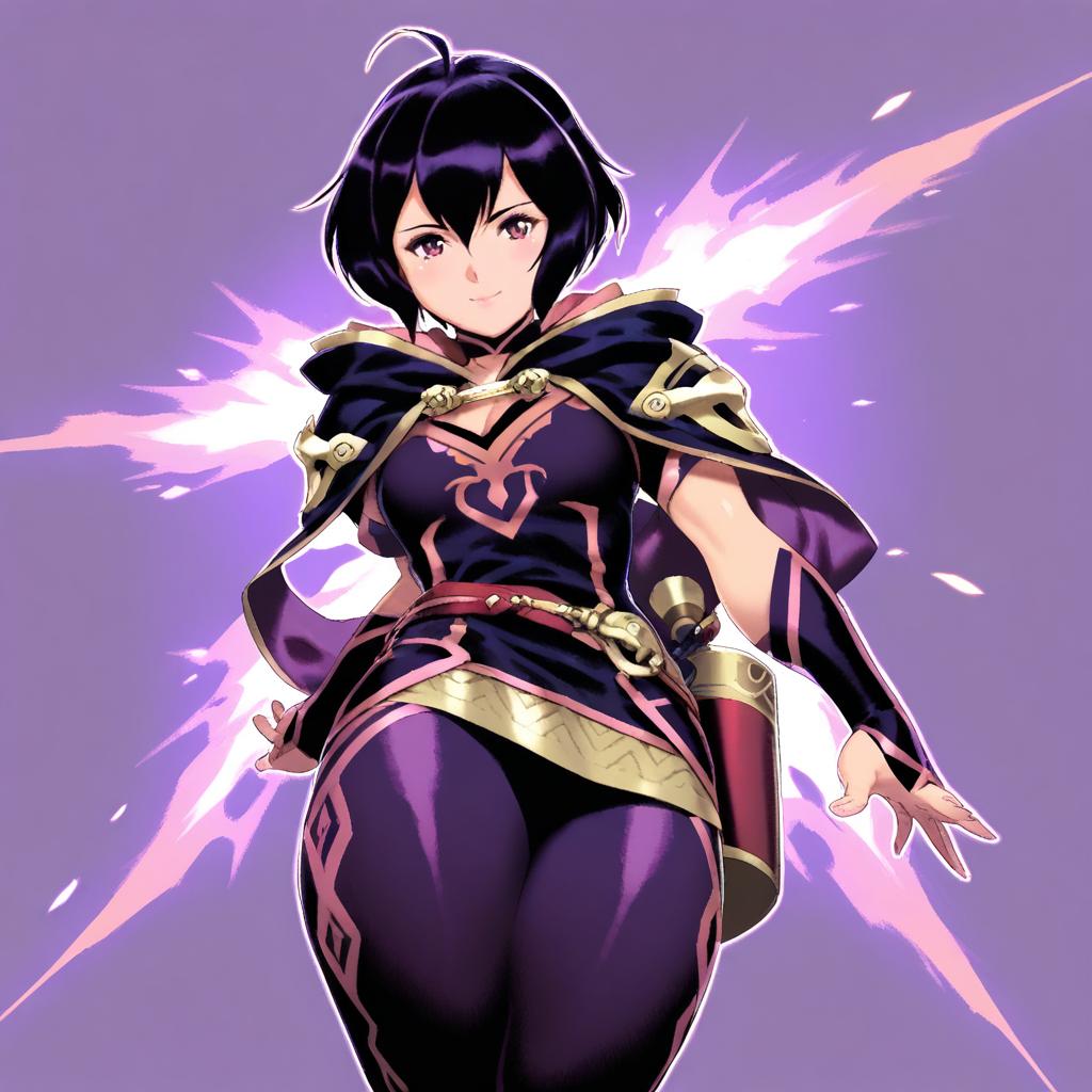 Morgan (female) (fire emblem), fire emblem, 1girl, purple eyes, short hair, black hair, ahoge, by artist po-ju, animagine