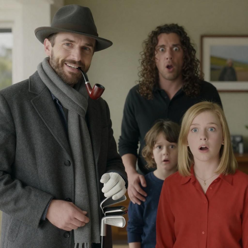 Photograph of a man with brown hair and beard, wearing a beige shirt and white gloves, lying on a green golf course, intently focusing on a pink golf ball near his putter. A person in the background holds a golf club. Trees and clear sky in the background.