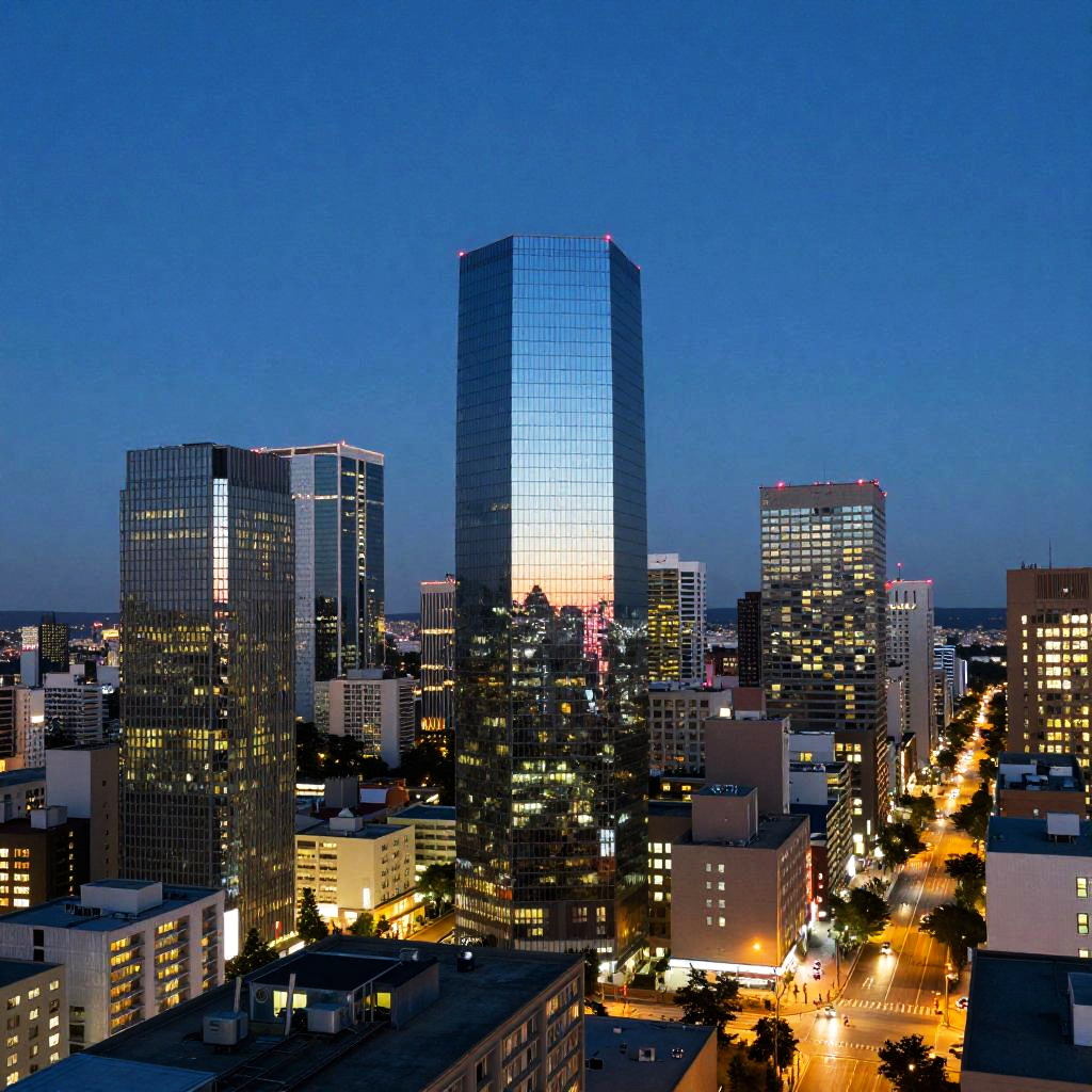 Removing jpeg artifacts on a high-resolution cityscape at dusk, crisp lines of buildings and bright city lights, ultra-clear textures on glass and metal, realistic reflections and shadows, cinematic atmosphere, vibrant color palette