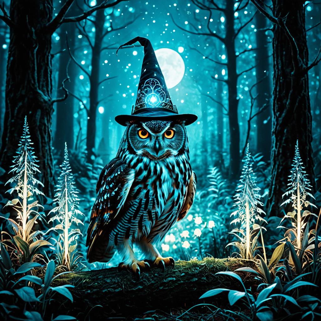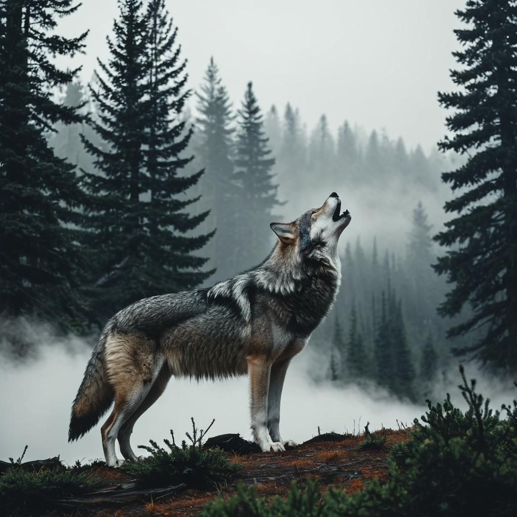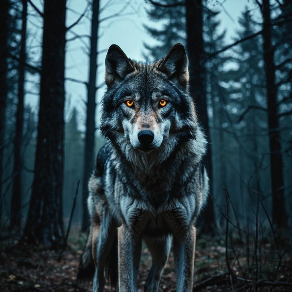 A wolf with glowing eyes standing in front of a haunted forest at twilight, eerie and mysterious