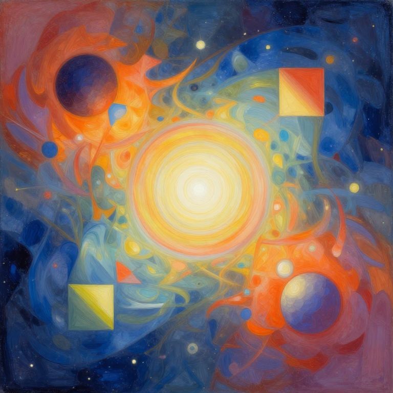 A vibrant abstract painting inspired by Kadinski, featuring geometric shapes and dynamic brush strokes in a cosmic theme. The artwork blends warm oranges and cool blues, creating a sense of cosmic harmony and spiritual awakening. Central circular forms resemble a glowing sun, surrounded by planetary and abstract shapes, evoking an impression of an abstract universe.