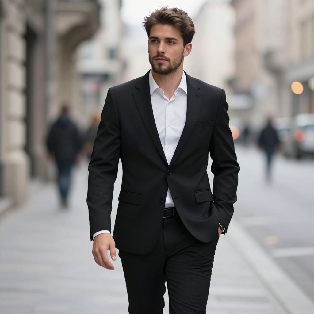 Photograph of a handsome young man with light skin and brown, neatly styled hair. He has a trimmed beard and is wearing a black suit with a white dress shirt, black trousers, and a black belt. He's walking down a blurred city street with his right hand in his pocket and a confident expression. The background is slightly out of focus with buildings and a few indistinct figures.