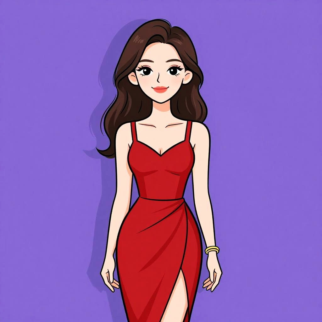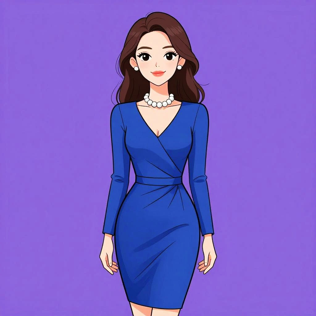 Digital illustration of a fair-skinned woman with long, wavy brown hair and blue eyes, standing against a solid purple background. She wears a form-fitting, long-sleeved, dark purple dress that accentuates her hourglass figure. Her expression is neutral with a slight smile, and she has red lipstick. The illustration style is clean and minimalistic with bold outlines and flat colors, reminiscent of anime or manga art. Her arms hang by her sides, and she is centered in the image.