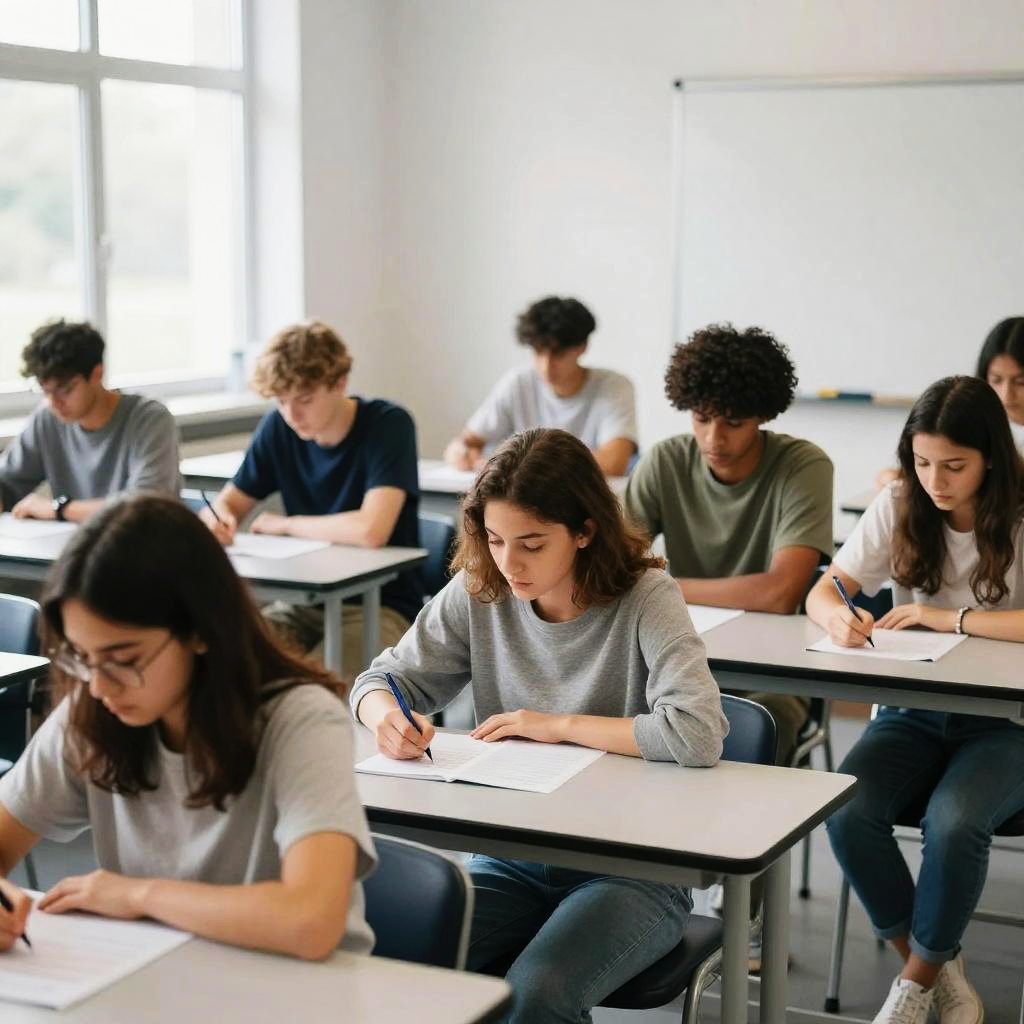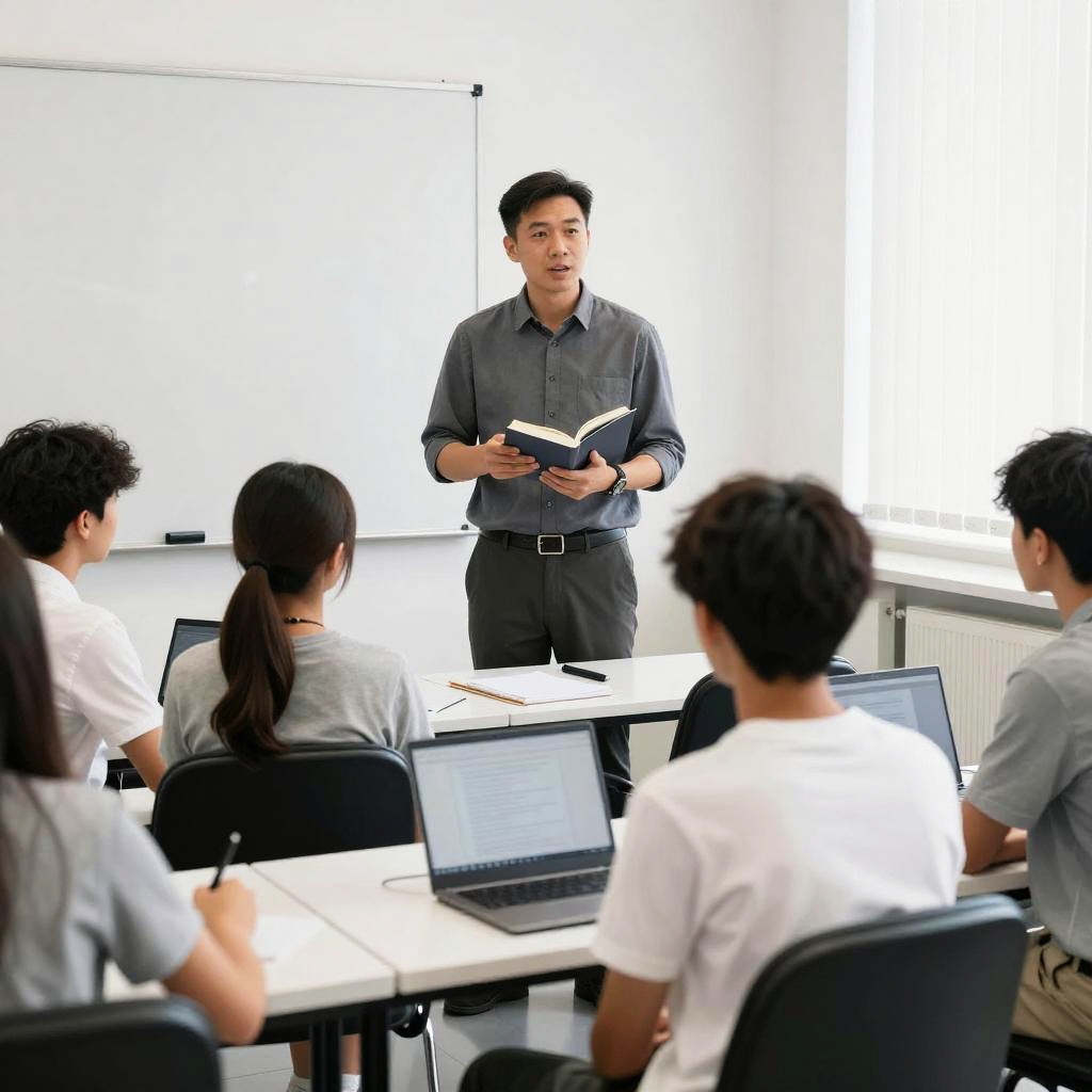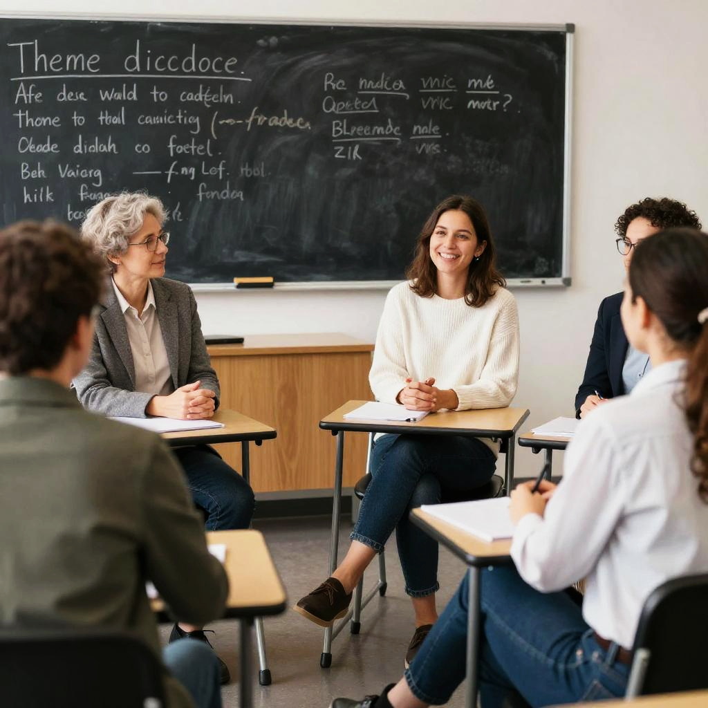 A group of diverse adults participating in a classroom discussion, a woman presenting with a white sweater and smile, others engaged and attentive, casual business attire, indoor classroom setting with blackboard that has text 'Theme for discussion', natural lighting
