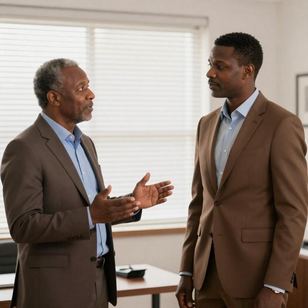 Photograph of two African-American men in a brightly lit office. Both wear brown suits and blue shirts. Man on left gestures with hands, facing man on right who stands with arms at sides. Window with blinds in background.