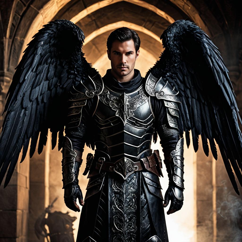 Photo-realistic image of a male dark angel warrior standing in front of an arched medieval doorway. He wears intricate black leather armor with detailed silver patterns and large black wings. The male figure has a handsome face with a chiseled jawline and brown hair, shown with a serious expression. The scene features dim lighting and smoke, enhancing the epic and fantasy atmosphere.