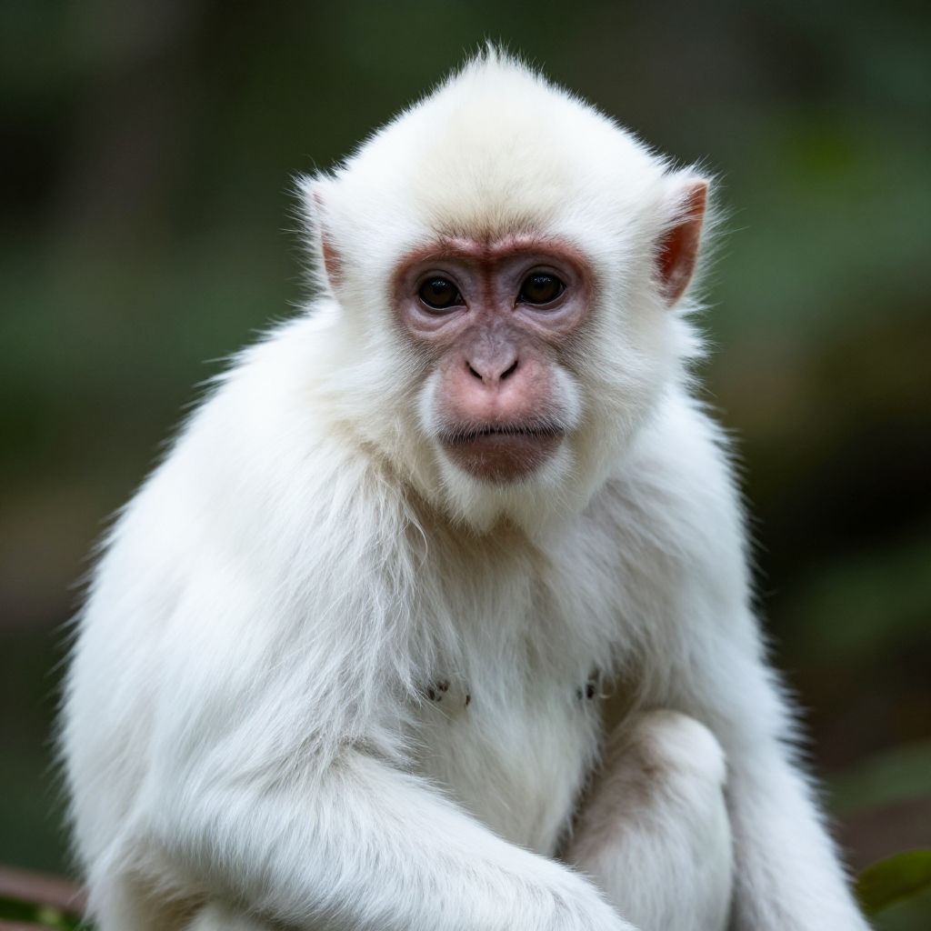 Close-up of white autistic monkey with delicate white fur, deep thoughtful eyes, sitting quietly in a serene forest environment, soft natural lighting emphasizing calm and introspection