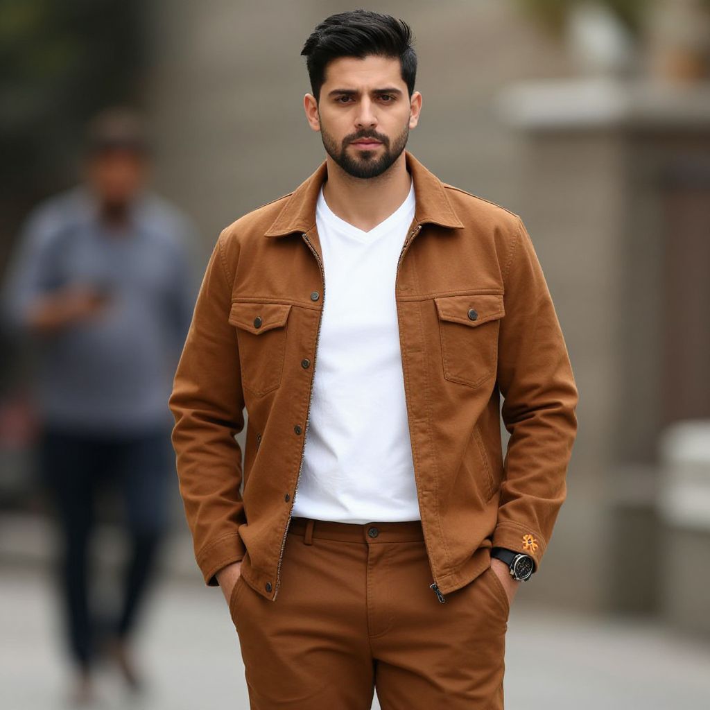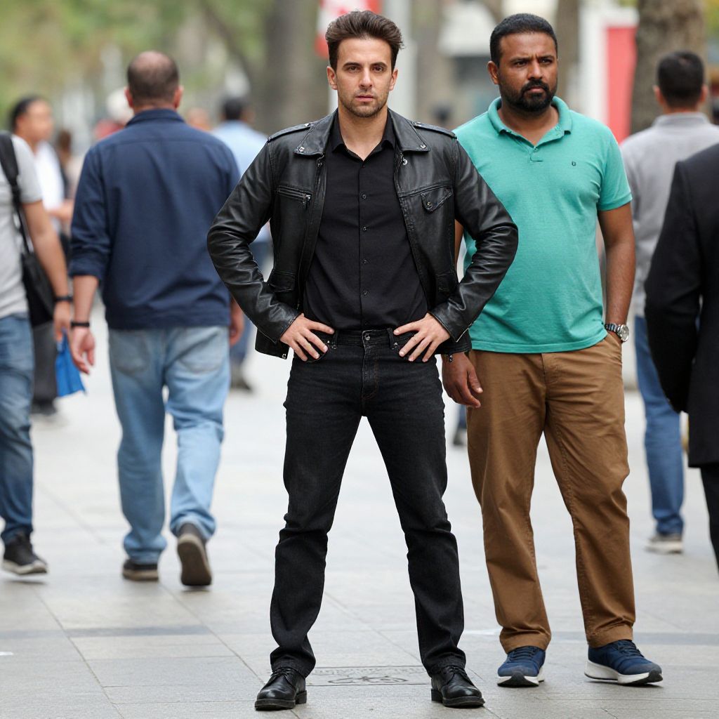 Man in black shirt and jeans with black shoes and a black leather jacket. He is standing with his hands on his hips and looking at the camera. Behind him, there is a man in a green shirt and brown pants. In the background, there are other people walking.