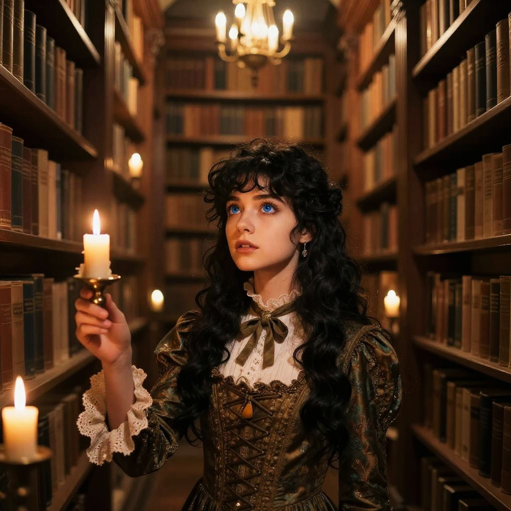 Blue eyes black hair girl exploring an enchanted library filled with towering bookshelves and floating candles, warm golden light illuminating her curious face, vintage Victorian style clothing, rich textures, magical realism art style, immersive and detailed environment