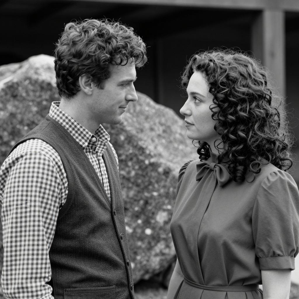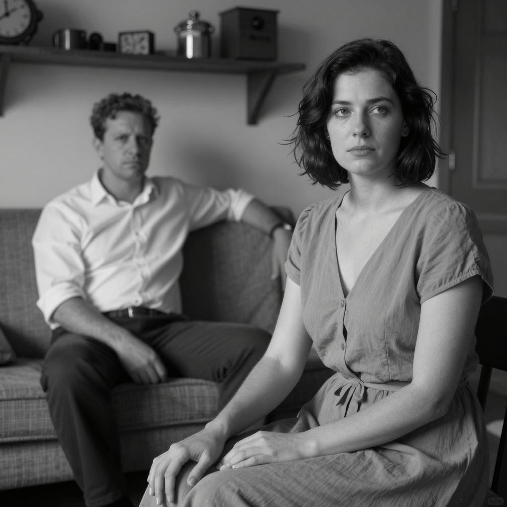 Black and white photograph of a man and woman standing in front of a tree. The woman has short dark hair, light skin, and wears a white blouse with floral trim. She looks to the left with a neutral expression. The man has dark hair, light skin, and wears a dark suit with a white shirt. He points to the right with his right hand and has a serious expression. The tree has rough bark with some small, dried leaves hanging from branches. The background is ured and dark.