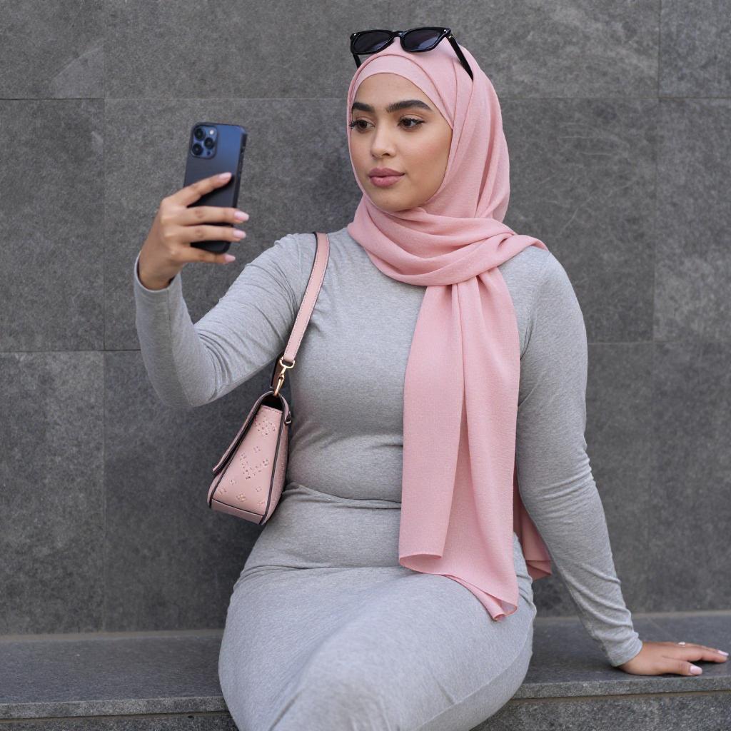 Photograph of a curvy woman with light skin and long pink hijab, wearing a tight gray long-sleeve top and matching pants. She holds a blue phone with a black case, taking a selfie against a gray stone wall. She has sunglasses on her head, a pink patterned purse on her shoulder, and sits on a stone ledge.