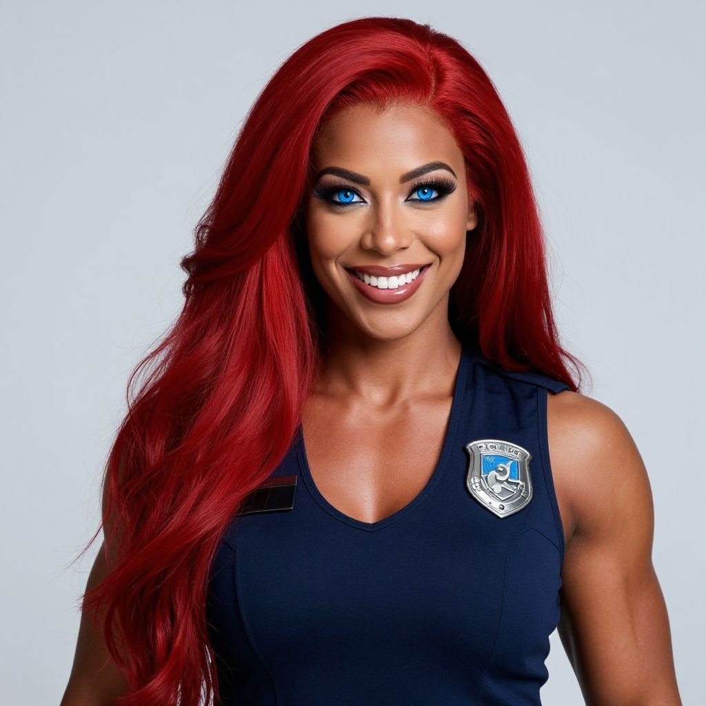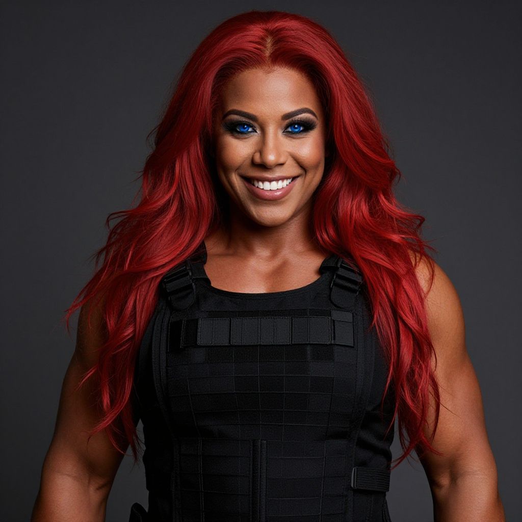 Photograph of a muscular Black woman with vibrant red hair, striking blue eyeshadow, and white teeth, smiling brightly in a black tactical vest,