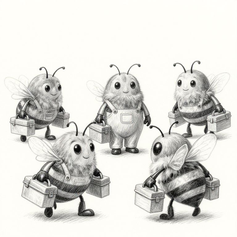 This digital black-and-white drawing features six adorable, anthropomorphic bees with large, expressive eyes and fluffy bodies. Each bee has striped black and white fur, small antennae, and wings. They are standing and holding briefcases, giving a professional appearance. Two bees wear small aprons, adding a work-like element. The background is plain white, focusing attention on the bees. The style is reminiscent of a cartoon or children's book illustration, with detailed line work and a playful, whimsical feel. The bees are positioned in a circular formation, with two at the front, two at the back, and one on each side.