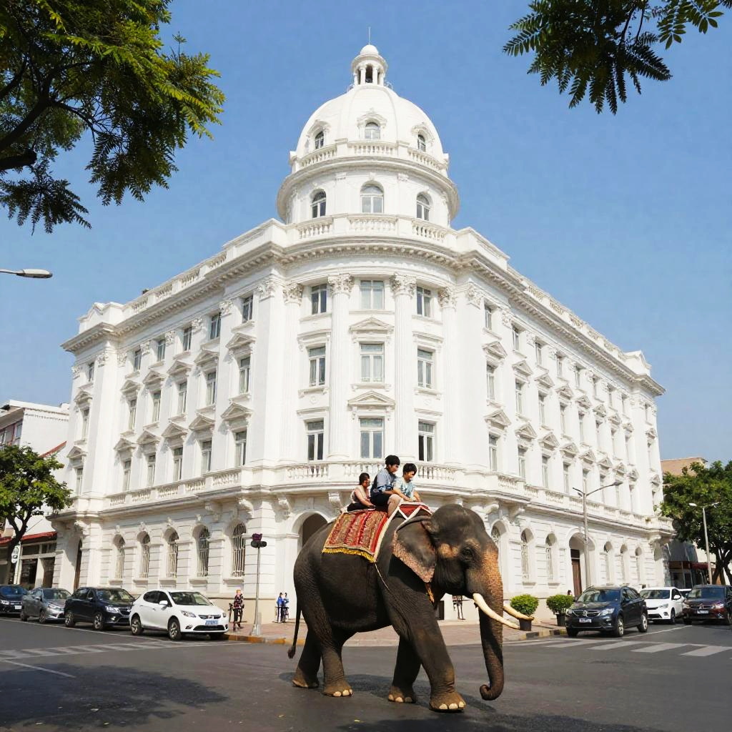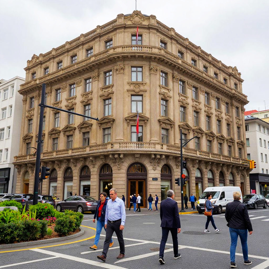 Photograph of a bustling city street corner featuring a grand, ornate, multi-story building with a warm beige facade, large windows, and flags hanging from the roof. Pedestrians, including men and women in casual and business attire, cross the street. Cars and a white van are parked along the curb. The street is lined with green shrubs and traffic lights.
