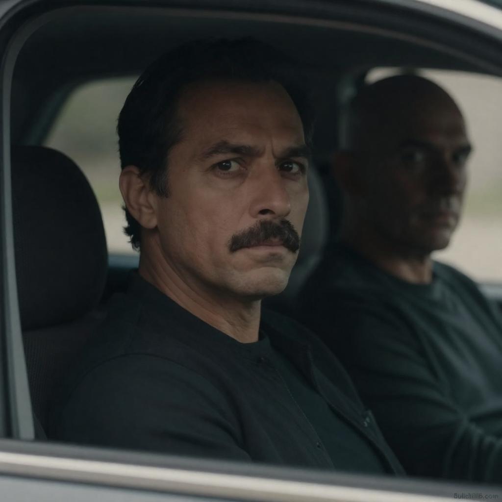 Photograph of a middle-aged man with short dark hair, wearing a black suit and white shirt, holding a silver handgun in his right hand while seated in a car. His expression is intense, with a slightly open mouth. The car's interior is visible, with a blurred green tree outside.