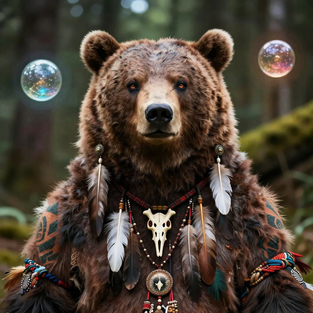 Portrait of a half bear half man shaman, serene expression with piercing eyes, decorated with feathers and bone jewelry, body covered in patchy fur and tribal tattoos, surrounded by floating spirit orbs and a forest background, vibrant colors, fantasy realism