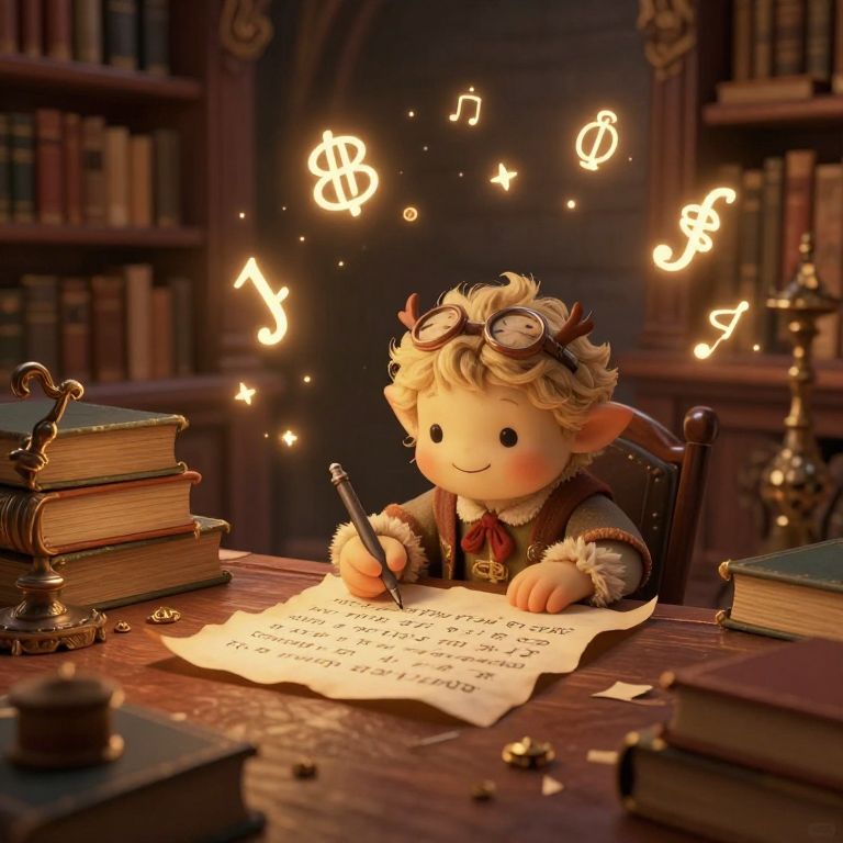 An imaginative ditty portrayal of a small magical being writing a cheerful song on parchment, seated in an ancient library filled with glowing books and floating symbols, intricate details, warm lighting, and a mystical ambiance.