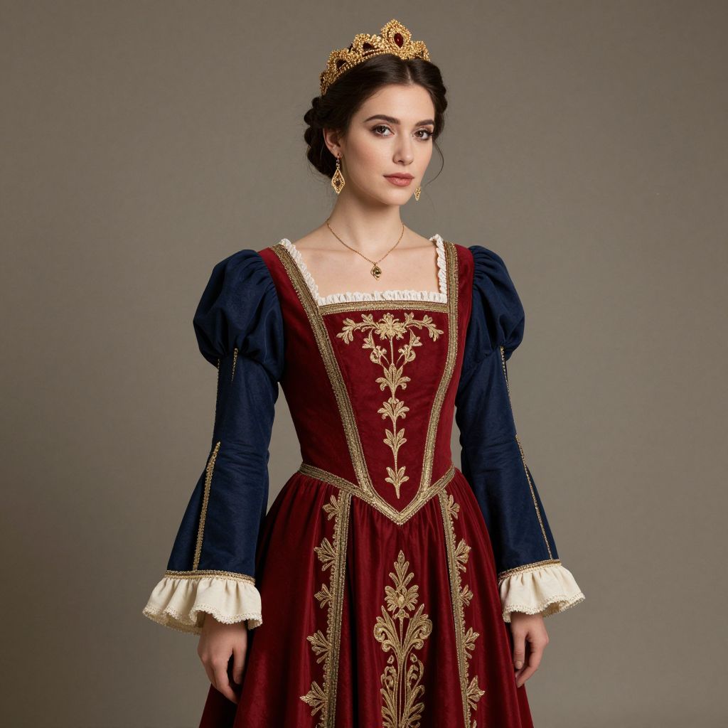 Elegantly poised woman wearing a richly detailed medieval gown featuring deep red fabric adorned with gold embroidery, complemented by a navy blue bodice with puffed sleeves and cream ruffled cuffs, accessorized with a golden tiara, dangling earrings, and a delicate necklace, set against a neutral backdrop.