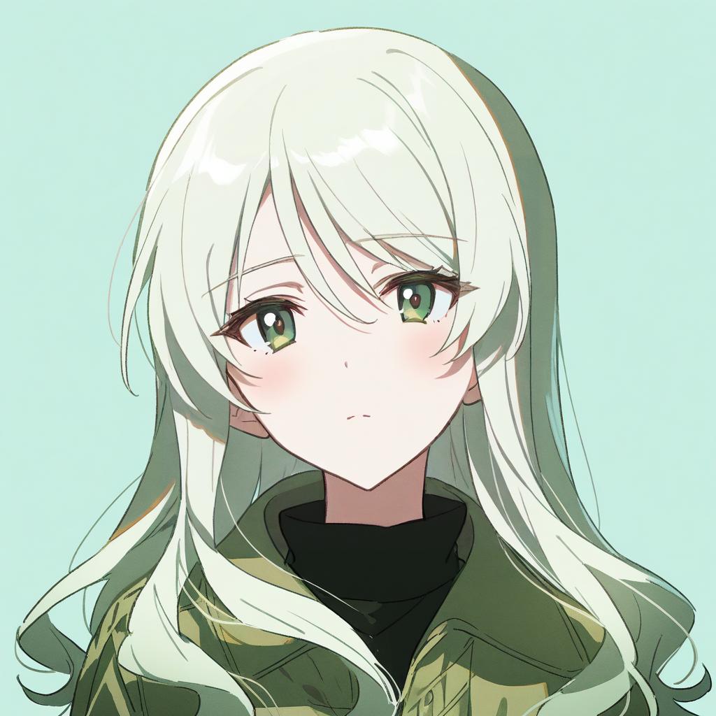Close-up digital artwork of an anime girl with long white hair and green eyes. The character is wearing a military-style green jacket over a black turtleneck. The background is plain light blue, emphasizing the character's soft facial features and calm expression.