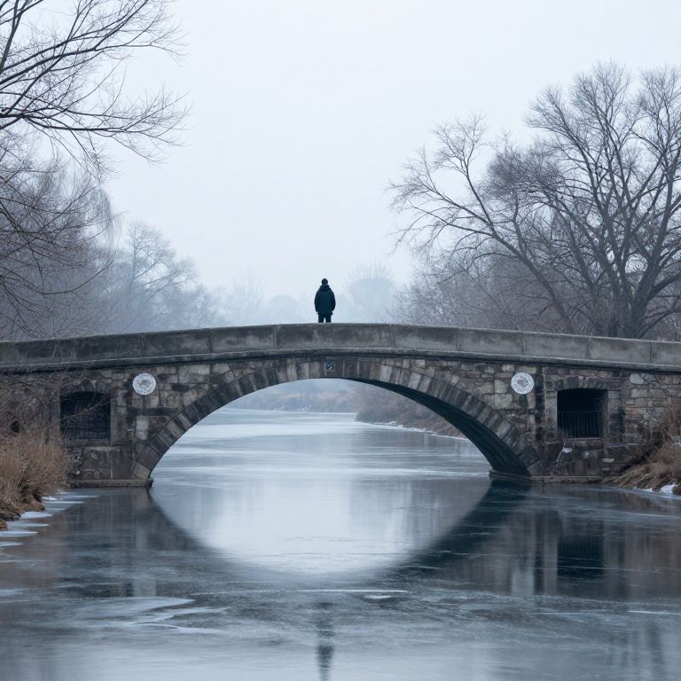 A solitary figure stands atop a stone arch bridge, gazing over a tranquil river that mirrors the icy stillness of winter, as bare trees frame the misty horizon.