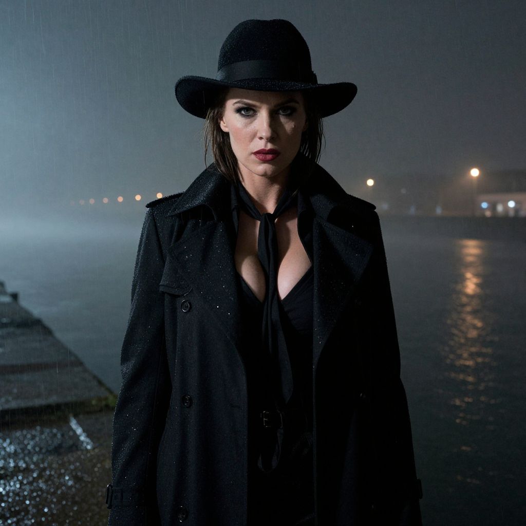 Photograph of a gritty, no-nonsense film noir detective woman with a strong jawline, pale skin, and a piercing stare, dressed in a tailored black trench coat and a wide-brimmed hat, standing at the edge of a foggy river under a stormy urban sky, raindrops glistening on her coat, deep shadows on one side of her face, creating dramatic contrast with the bright streetlights in the distance. The woman has big tits and cute face