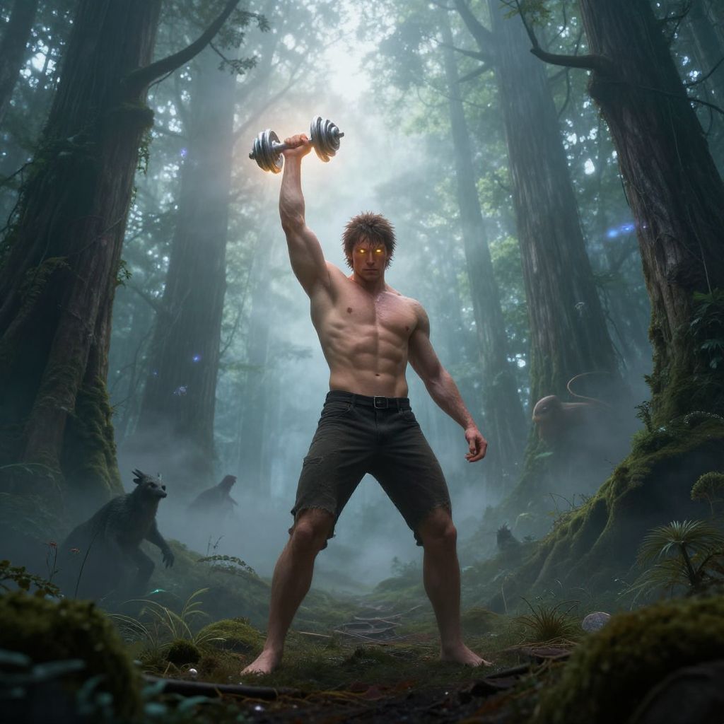 Digital artwork of a muscular, shirtless man with short, spiky brown hair, standing in a mystical forest. He holds a dumbbell aloft in his right hand, revealing glowing yellow eyes. He wears black cargo shorts and stands on a mossy, forest floor. The background features towering trees with dense foliage and ethereal light filtering through. Shadowy, beast-like creatures lurk in the misty background, adding a sense of danger. The scene is illuminated by a soft, blue-white light, enhancing the forest's mystical atmosphere. The man's defined abs and biceps are prominently highlighted.