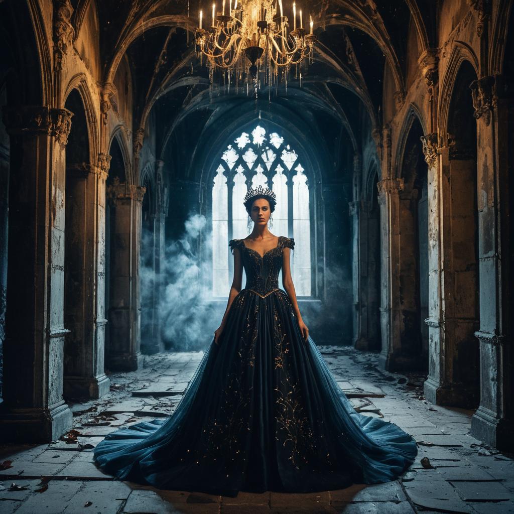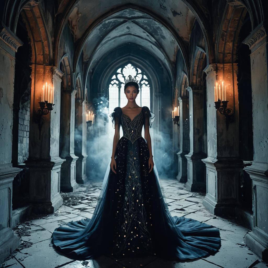 Dramatic high-fashion editorial set in abandoned Gothic castle hallway at twilight, showcasing an elegant queen in lotus silk gown, enveloped by ethereal sparks and cascading candlelight haze, rendered as an intricate oil painting with multiple exposure, Vogue cover style, cinematic lighting by Stanley Kubrick and Greg Rutkowski.