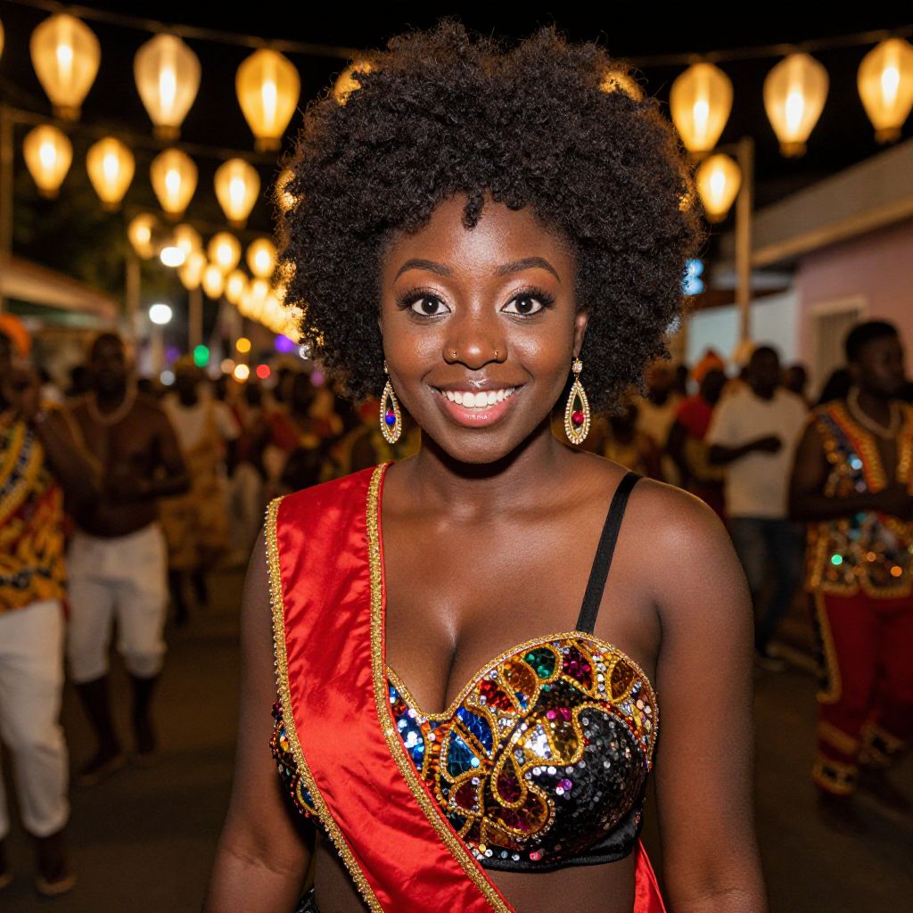 A joyful young woman of African descent with large, expressive eyes and a warm smile poses in a festive nighttime parade, dressed in a sequined and embroidered traditional costume with a bright red sash, her natural afro puff hairstyle standing tall and full, catching the glow of lanterns and colorful lights, the setting showing a bustling street with dancers and music.. The woman has big breasts and cute face