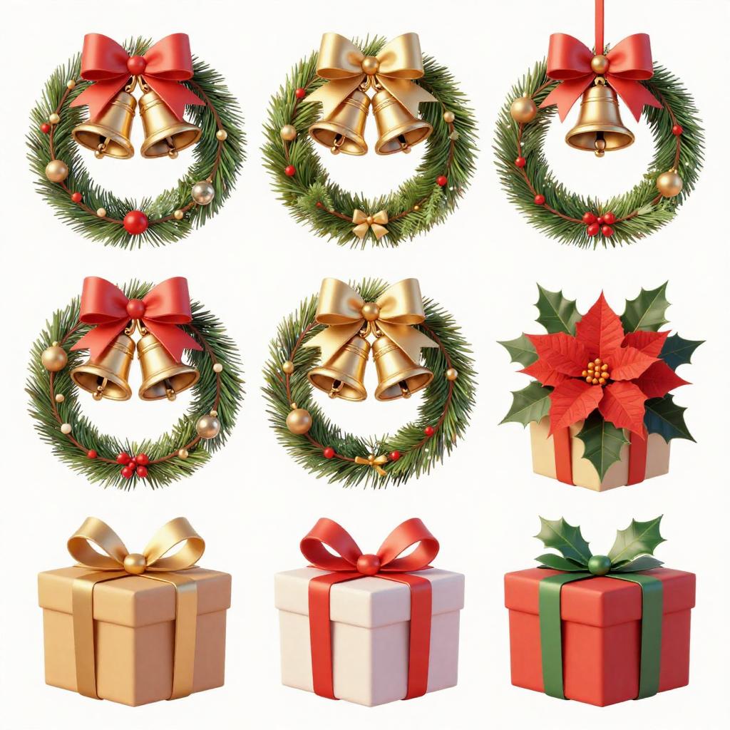 This is a colorful digital illustration featuring various Christmas-themed decorations and gift boxes. The image showcases detailed pine wreaths, red and gold bows, bells, poinsettias, holly, and wrapped presents with ribbons. The lighting is even, highlighting each element clearly. The camera angle is straight-on, with a shallow depth of field keeping the foreground in sharp focus while the background is slightly blurred.